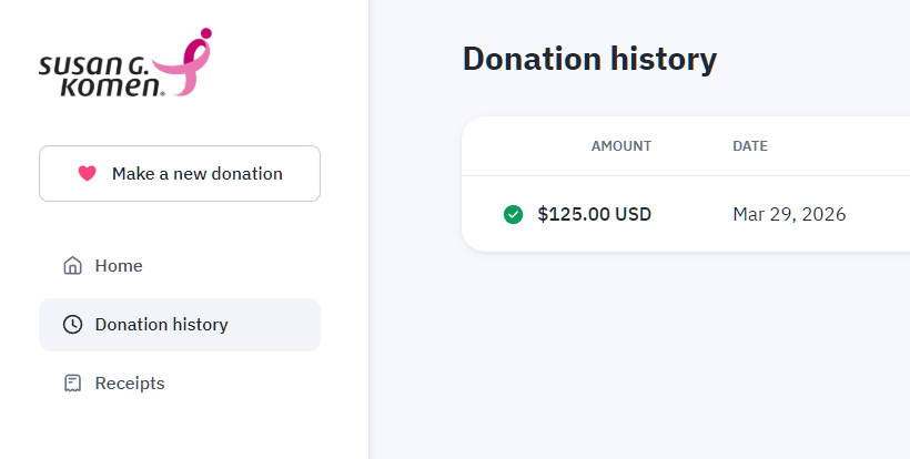 Latest Donation to the Susan G. Komen. Thank you for your support and helping us grow our monthly giving.